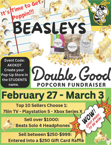 Please help Beasley fundraise to purchase school wide math and reading materials for next school year! From February 27 - March 3 please sell popcorn from your pop up store using code AKOKDT. Sell the most and win Prizes!!! Please see the flyer for more information.