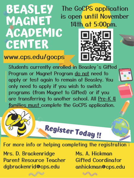 If you would like to apply for Pre-K, transfer into Beasley or move from Magnet to Gifted, you can apply on GoCPS now through November 14th at 5pm. Use the QR code on the flyer or click the link below.