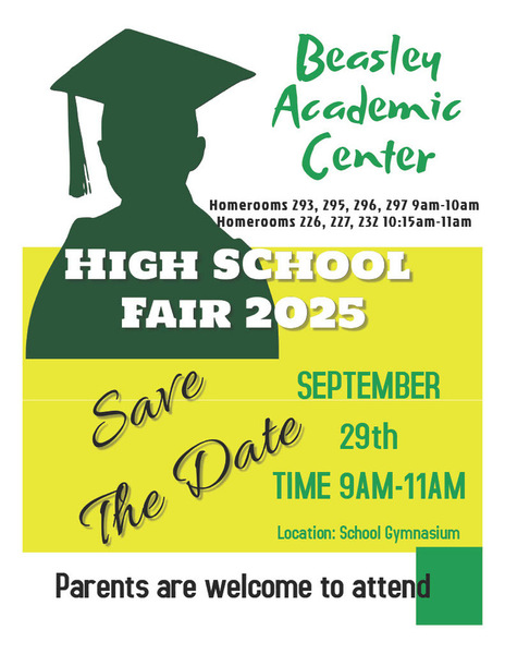 Beasley will host a High School Fair for its 7th & 8th Grade students. There the students will be able to talk to representatives from high schools across the city. Parents are welcome to attend. Please see the attached flyer for times according to your students class.